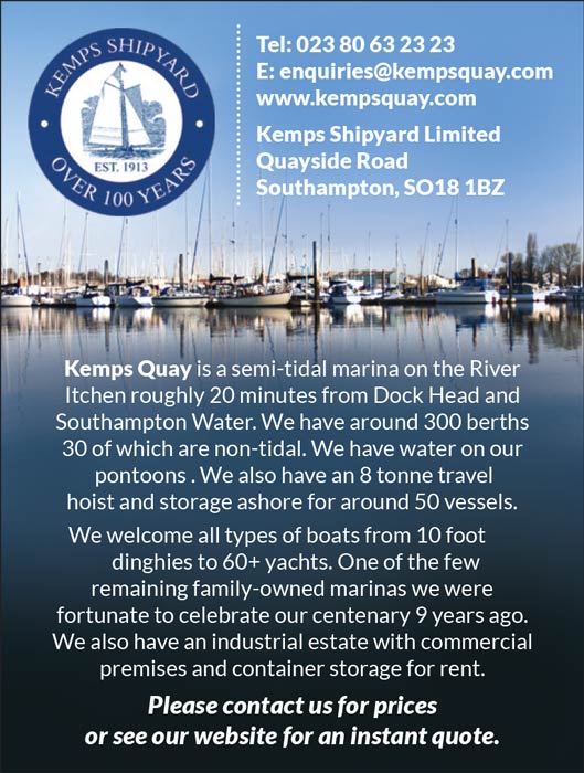 We at Kemps Quay are a semi-tidal marina on the River Itchen roughly 20 minutes from Dock Head and Southampton Water. We have around 300 berths 30 of which are non-tidal. We have water on our pontoons as well as an 8 tonne travel hoist and storage ashore for around 50 vessels. We welcome all types of boats from 10 foot dinghies to 60+ yachts. One of the few remaining family-owned marinas we were fortunate to celebrate our centenary 9 years ago. We also have an industrial estate with commercial premises and container storage for rent.